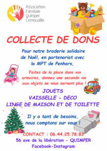 Dépôt des dons les lundis, mardi, jeudi et vendredis de 13.30 à 16h – 8, rue Georges Philippar à Quimper ou